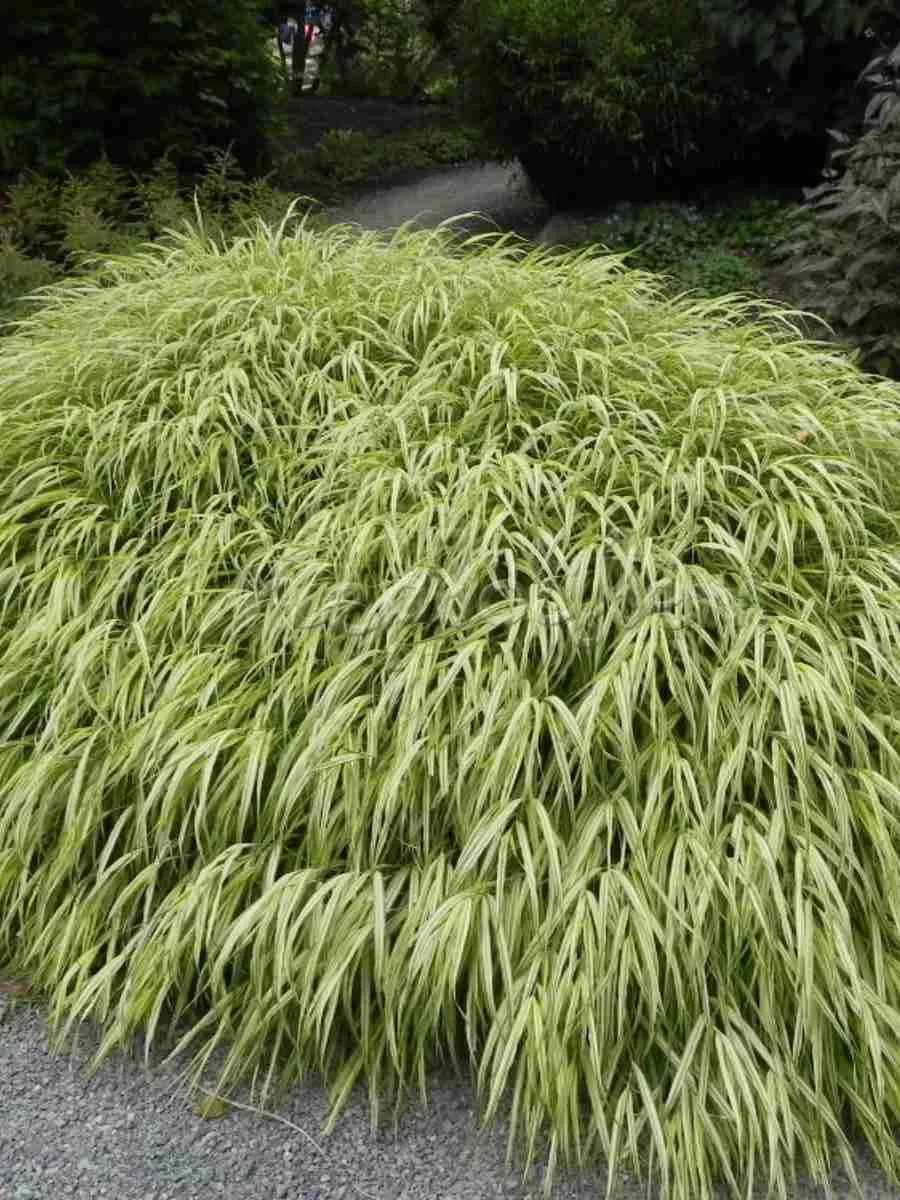 Хаконехлоа большая (Hakonechloa macra), элегантная представительница семейства злаковых родом из Японии, пленяет взор своей живописной формой и нежностью окраски. Это многолетнее травянистое растение образует пышную куртинку высотой до полуметра, состоящую из тонких, слегка извилистых стеблей, покрытых узкими листьями длиной около 15–20 см. Листья имеют характерную дугообразную форму, словно струящиеся ленты, плавно ниспадающие каскадом от основания куста. Их изумрудно-зелёная поверхность летом постепенно приобретает золотисто-жёлтые оттенки осенью, создавая эффект переливающейся волны. Цветёт хаконехлоа мелкими невзрачными колосками, собранными в рыхлые метельчатые соцветия, едва заметные среди роскоши листвы. Растение предпочитает полутень и влажные плодородные почвы, прекрасно адаптируясь к умеренному климату и украшая тенистые уголки садов изысканным восточным шармом.