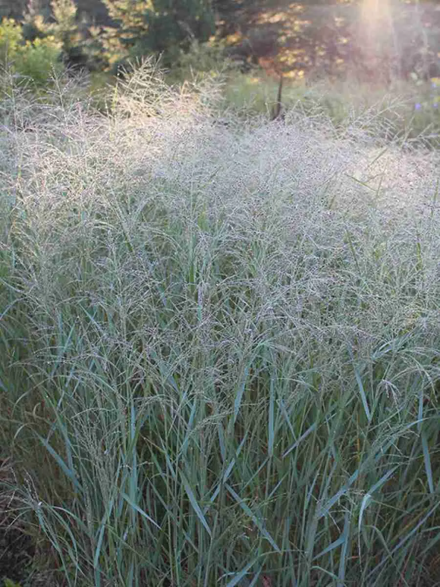Просо прутьевидное (Panicum virgatum L.) — многолетняя травянистая культура, обладающая стройностью и грациозностью высоких злаков. Стебли прямые, крепкие, достигают высоты от одного до двух метров, покрыты нежной зеленовато-голубоватой дымкой, придающей растению особую воздушность и легкость. Листья линейные, узколанцетные, слегка шероховатые, окрашены в серебристый оттенок, который переливается на солнце, создавая впечатление мерцания. Цветки собраны в крупные метельчатые соцветия, состоящие из множества мелких колосков, украшенных золотистыми пыльниками, словно крошечные солнечные зайчики среди зелени. Растение предпочитает плодородные почвы, хорошо освещённые участки, легко адаптируется к различным климатическим условиям, распространено преимущественно в степях и лесостепи Евразии, где образует живописные заросли, привлекающие внимание своей утончённой красотой и благородством форм.