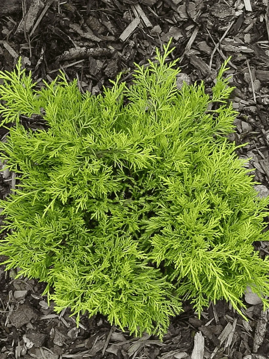 Можжевельник средний *Golden Joy* представляет собой живописную кустарниковую форму с компактной кроной, раскинувшейся горизонтально широкими ветвями, словно золотое кружево, укрывающее землю мягким ковром. Его игловидные листья окрашены в нежнейшие оттенки лимонно-золотистого цвета, переливающегося солнечными бликами даже в пасмурные дни. Весной растение украшается мелкими голубовато-синими шишкоягодами, придающими особую декоративность композиции сада. Медленно растущий можжевельник отличается неприхотливостью и устойчивостью к неблагоприятным условиям среды, прекрасно сохраняя свою привлекательность круглый год. Этот миниатюрный представитель хвойных идеально подходит для рокариев, альпийских горок и небольших садов, где способен стать истинным украшением ландшафта благодаря своей изысканной форме и благородному цвету листвы.