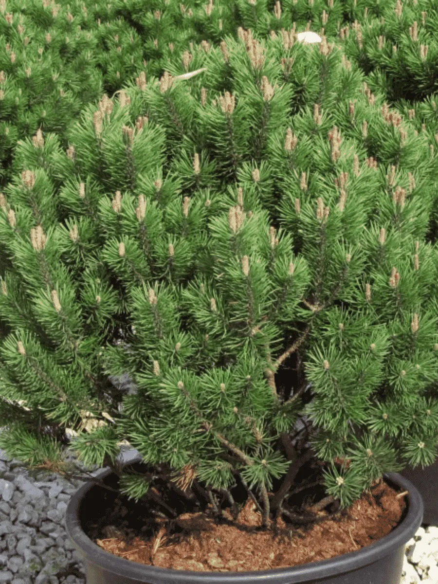 Сосна горная сорта *Mops* представляет собой компактную карликовую хвойную красавицу, покоряющую сердца садоводов своей миниатюрностью и декоративностью. Её густые ветви образуют аккуратную округлую крону, словно пушистый шарик, покрытый игольчатыми листьями насыщенного зелёного цвета. Иглы короткие, мягкие, слегка загнутые внутрь, создавая впечатление нежной бархатистости. Растёт медленно, ежегодно прибавляя лишь несколько сантиметров, сохраняя свою очаровательную форму долгие годы. Цветение сосны проявляется в появлении небольших шишек, придающих деревцу особую прелесть весной и летом. Этот сорт прекрасно адаптируется к различным условиям произрастания, легко переносит засуху и мороз, украшая сады и парки своим вечнозелёным обликом круглый год.