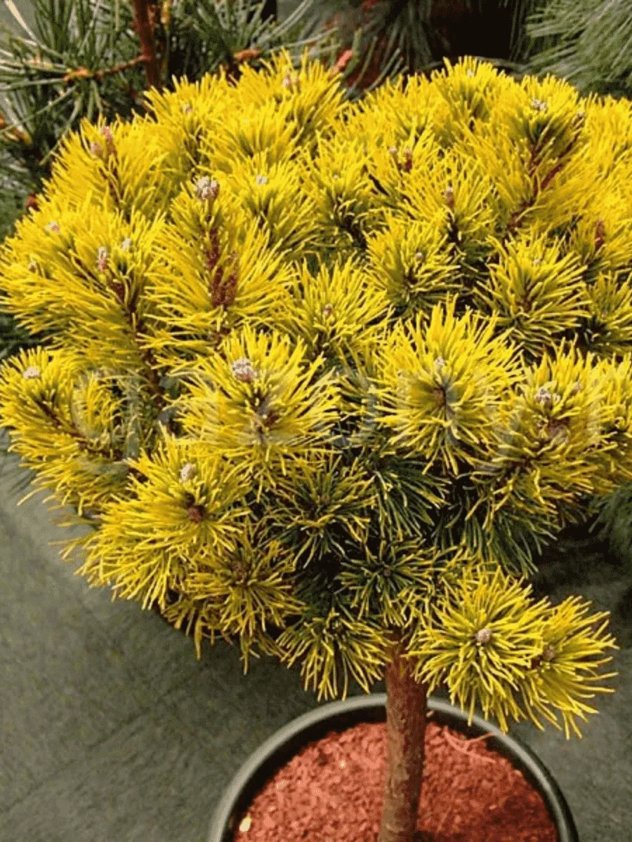Сосна горная *Winter Gold* штамб представляет собой компактную декоративную разновидность сосны, отличающуюся элегантной формой кроны и необычной золотисто-жёлтой окраской хвои зимой и ранней весной. Это медленнорастущее дерево обладает густой пирамидальной кроной, состоящей из коротких иголок длиной около двух-трёх сантиметров, собранных в пучки по две штуки. Летом хвоя приобретает насыщенный зелёный оттенок, который осенью сменяется ярким лимонно-золотистым цветом, особенно заметным после первых морозов. Растёт преимущественно вертикально вверх, сохраняя стройность и аккуратность формы даже во взрослом состоянии. Благодаря своей неприхотливости и устойчивости к неблагоприятным условиям среды широко используется в ландшафтном дизайне для украшения садов и парков, где её нарядная внешность неизменно привлекает внимание ценителей красоты природы.