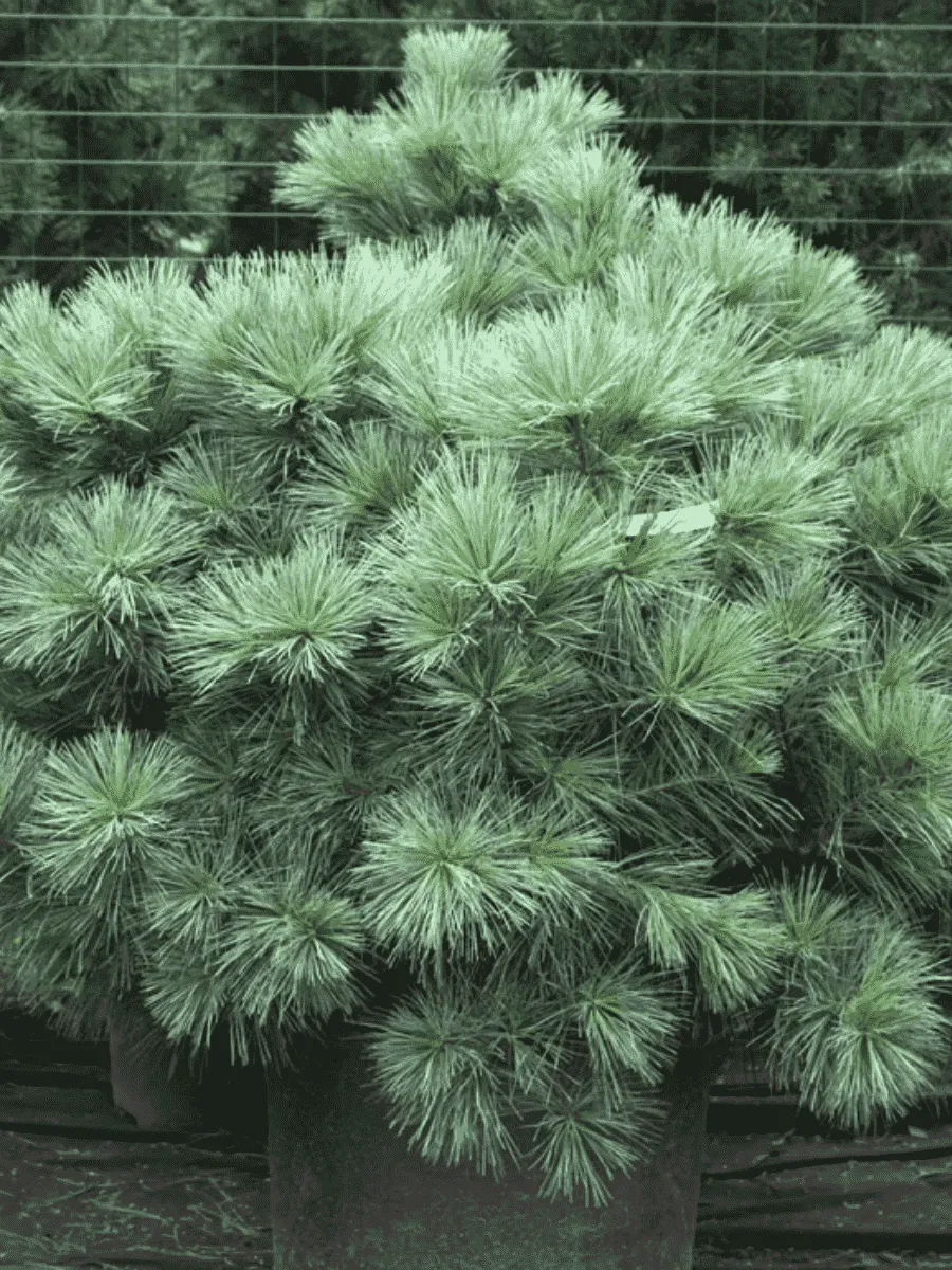 Сосна Веймутова Макропин (Pinus strobus 'Macrophylla') представляет собой величественное хвойное дерево с раскидистой кроной, устремлённой вверх стройной колоннообразной формой ствола и серебристо-зелёной хвоей необычайной длины до 15–20 см, придающей растению особую декоративность и утончённость облика. Молодые побеги покрыты нежнейшей светло-жёлтой корой, постепенно приобретающей характерную серовато-коричневую окраску с глубокими трещинами. Хвоя собрана в пучки по пять иголок, тонкие и мягкие, слегка закрученные, блестящие, словно покрытые тонким слоем воска, придают дереву воздушности и лёгкости. Цветёт сосна мелкими жёлтыми мужскими шишечками и красновато-розовыми женскими соцветиями, расположенными преимущественно на концах ветвей. Растёт медленно, достигая зрелости лишь спустя несколько десятилетий, предпочитая солнечные места и плодородные почвы умеренного климата Северной Америки, где она широко распространена от Канады до южных штатов США, украшая парки, сады и лесопарковые зоны своей благородной красотой и элегантностью форм.