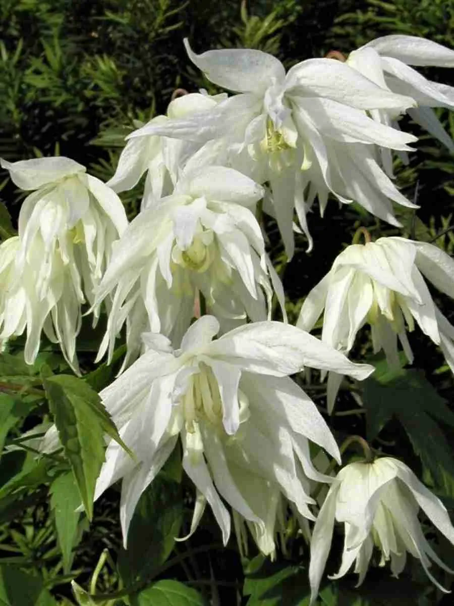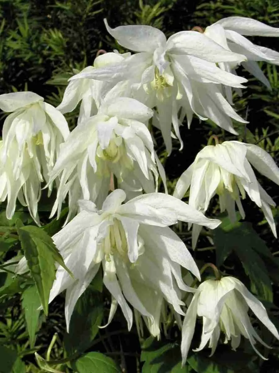 Клематис сорта *Albina Plena* пленяет взор своей изысканной красотой и нежностью форм. Это многолетняя лиана с гибкими побегами, достигающая высоты до трёх метров, украшенная крупными сердцевидными листьями насыщенного зелёного цвета, слегка блестящими и гладкими на ощупь. Цветки крупные, диаметром около десяти сантиметров, собраны в рыхлые соцветия, распускаются пышной волной летом и осенью, очаровывая белоснежными лепестками, собранными в двойную розетку, словно кружевная манишка, окутывающая середину цветка. Лепестки тонкие, полупрозрачные, переливающиеся перламутром на солнце, придают растению воздушность и лёгкость. Растёт быстро, легко взбирается вверх по опорам благодаря крепким усикам, создавая живописные композиции на беседках, арках и стенах зданий. Предпочитает солнечные места, плодородные почвы и умеренный полив, радуя садоводов своим долгим цветением и способностью украшать пространство даже в тени крупных деревьев.