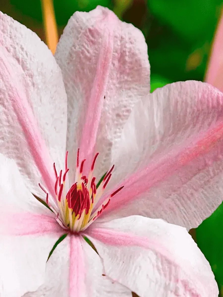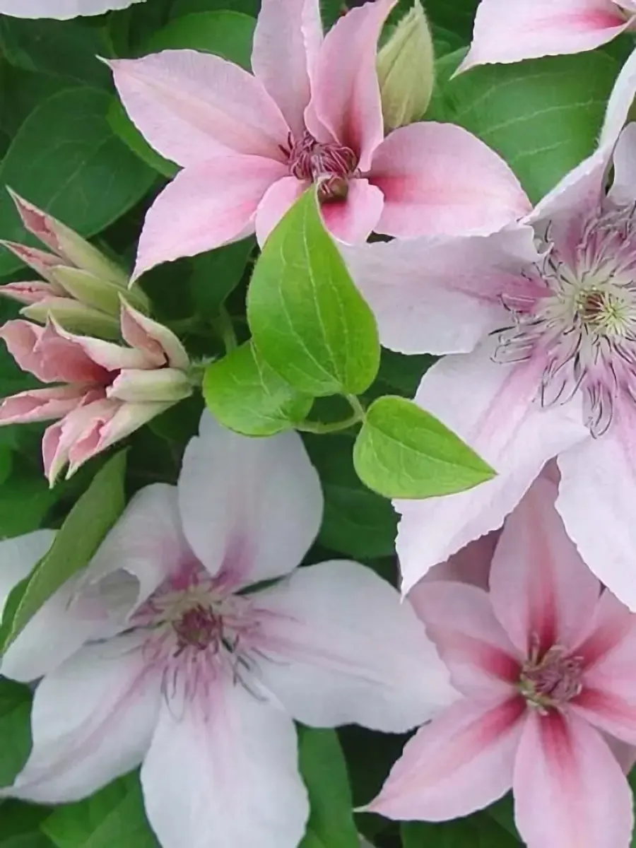Клематис гибридный *Jan Pawel II* пленяет взор роскошью крупных цветков насыщенно-розового оттенка, украшенных нежной кремово-белой сердцевиной и золотистыми тычинками, словно драгоценная брошь среди зелени сада. Листья перистые, рассечённые на несколько овальных листочков, покрыты мягким пушком, придающим растению бархатистый шарм. Цветки распускаются обильно, начиная с июня и продолжаясь до глубокой осени, создавая живописную картину пышного цветения. Стебли гибкие, цепляющиеся усиками, позволяют клематису легко взбираться вверх, покрывая опоры густым ковром цветов. Растёт быстро, предпочитает солнечные места и плодородные почвы, демонстрируя свою красоту во всей полноте там, где получает достаточно света и заботы садовода.