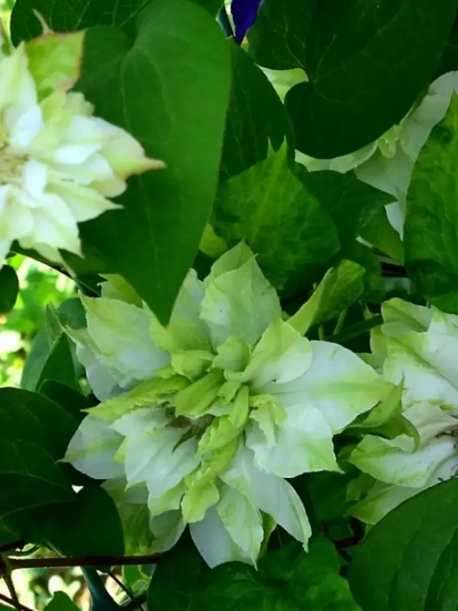 Клематис гибридный **Kohana** пленяет взор роскошной кроной густо покрытых тёмно-зелёных блестящих листочков, собранных в тройчатые сложноперистые композиции, придающие растению элегантную воздушность и утончённую декоративность. Цветки крупные, диаметром около десяти сантиметров, раскрываются пышным каскадом нежнейших оттенков от кремово-белого до светло-жёлтого, украшенные золотистыми тычинками, словно сотканными из солнечных лучей. Бутоны появляются обильно, начиная с июня и продолжаясь вплоть до первых осенних заморозков, превращая растение в великолепный живописный элемент сада. Мощная лиана быстро разрастается, достигая высоты трёх метров, легко цепляясь гибкими побегами за опоры и создавая эффектные вертикальные акценты в ландшафтных композициях.