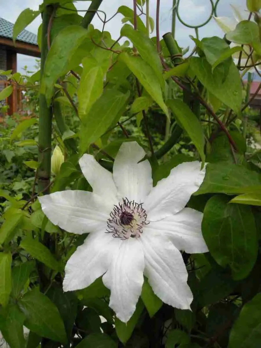 Клематис гибридный *Matka Urszula Ledóchowska* пленяет взор роскошью своего цветения и благородством облика. Это мощная лиана с гибкими побегами, достигающая высоты до трёх метров, украшенная крупными сердцевидными листьями насыщенного зелёного цвета, слегка блестящими и гладкими на ощупь. Цветки крупные, диаметром около десяти сантиметров, распускаются пышной волной летом и осенью, поражают нежностью оттенков от чистого белого до кремово-жёлтого с едва заметным лимонным оттенком, создавая впечатление изысканной фарфоровой росписи. Сердце цветка украшают многочисленные тычинки золотисто-жёлтой окраски, придающие особую воздушность композиции. Растение предпочитает солнечные места, хорошо дренированные почвы и требует опоры для полноценного развития своей красоты. Этот сорт отличается устойчивостью к болезням и неприхотливостью в уходе, радуя садоводов продолжительным периодом декоративности и способностью легко адаптироваться к различным условиям произрастания.