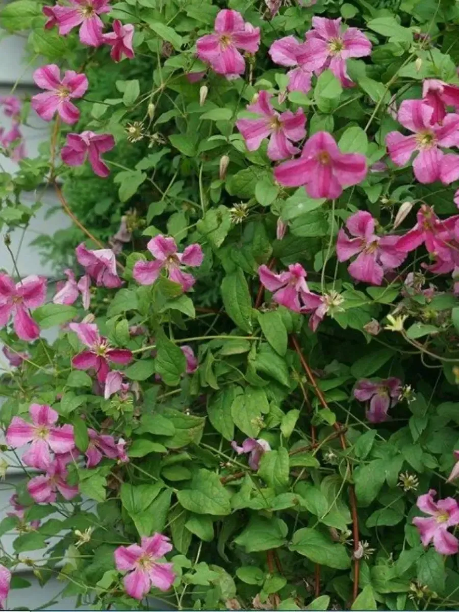 Клематис гибридный *Mazurek* пленяет взор роскошной зеленью крупных сердцевидных листьев, покрытых нежным бархатистым пушком, словно бережно укрытых утренней дымкой. Его побеги устремляются вверх мощными струящимися линиями, достигая высоты до трёх метров, создавая живописную живую завесу. Цветки раскрываются щедрым фейерверком ярких красок, поражают крупными размерами (до 15 см), формой элегантных чашечек и насыщенным пурпурно-фиолетовым оттенком лепестков, украшенных серебристо-белыми штрихами, будто кистью мастера нанесёнными лёгкими мазками. Бутоны появляются обильно, начиная с июня и вплоть до первых осенних заморозков, превращая растение в великолепный каскад цветов, привлекающий внимание своей изысканной красотой и утончённостью форм.