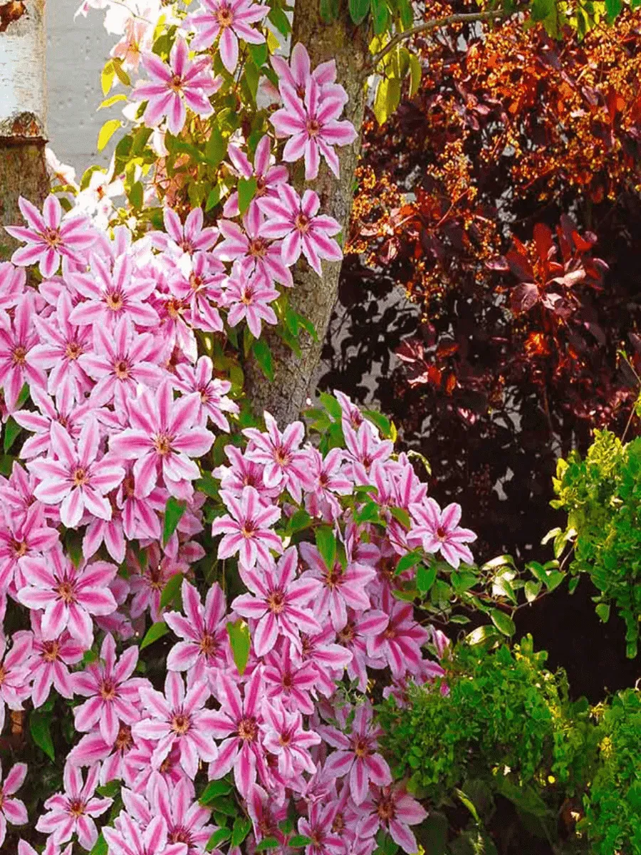 Клематис гибридный *Nelly Moser* пленяет взор роскошью цветения и утончённостью форм. Это мощная лиана с гибкими побегами длиной до четырёх метров, легко взбирающаяся вверх благодаря крепким усикам-листочкам. Листья тёмно-зелёные, блестящие, дважды тройчатые, состоят из овальных листочков с зубчатым краем, придающих растению благородную пышность. Цветки крупные (до 15 см), элегантной формы, распускаются обильно и долго, начиная с июня и продолжаясь до сентября. Лепестков шесть, нежно-розовые с широкой сиренево-фиолетовой полосой вдоль центральной жилки каждого лепестка, создавая чарующий контраст оттенков. Сердцевина цветка украшена пучком золотистых тычинок, добавляющих солнечный акцент композиции. Растёт быстро, предпочитает солнечные места и плодородные почвы, широко используется в вертикальном озеленении садов и парков, где становится настоящим украшением ландшафта своей изысканной красотой и нежностью красок.