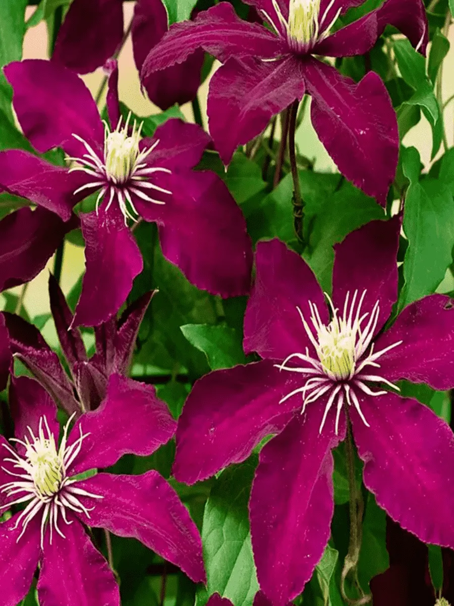 Клематис гибридный *Niobe* пленяет взор роскошной красотой крупных темно-красных цветков, словно капли расплавленного рубина, сияющих среди густой зелени лианоподобных стеблей. Листья перистые, рассечённые на несколько овальных листочков с зубчатыми краями, создают живописную ажурную крону, подчёркивая изысканность каждого цветка. Цветки одиночные либо собраны в небольшие группы, раскрываются широко раскрытыми чашевидными венчиками диаметром до 15 см, состоящими из четырёх широких лепестков-лепестников, плавно переходящих от насыщенного красного оттенка к тёмному бархатисто-чёрному центру. Бутоны появляются уже в конце весны и радуют глаз вплоть до осени, превращаясь в пышный каскад ярких красок, украшающий стены домов, беседки и арки садов. Гибкий побег клематиса легко цепляется за опоры тонкими усиками, позволяя растению стремительно подниматься вверх, достигая высоты до трёх метров и создавая эффектные вертикальные композиции.