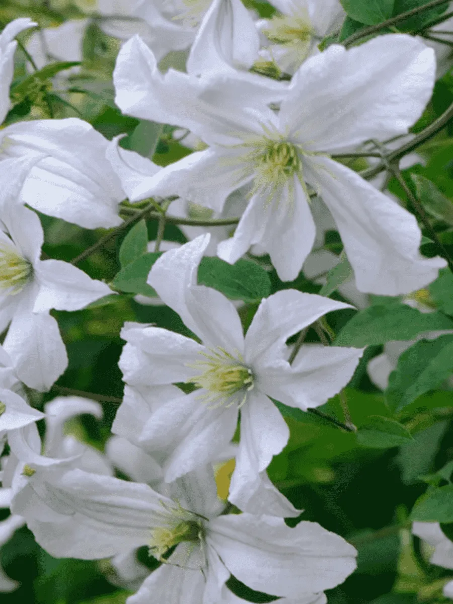 Клематис сорта *White Prince Charles* пленяет взор своей изысканной красотой и благородством форм. Это многолетняя лиана с гибкими побегами, достигающая высоты до трёх метров, украшенная крупными сердцевидными листьями насыщенного зелёного цвета, слегка блестящими и гладкими на ощупь. Цветки крупные, диаметром около десяти сантиметров, распускаются пышной волной летом и осенью, очаровывая нежностью белоснежных лепестков с едва уловимым кремовым оттенком и золотистыми тычинками в центре. Их аромат тонкий, едва ощутимый, придаёт саду особую атмосферу утончённости и гармонии. Растение предпочитает солнечные места, хорошо дренированные почвы и регулярную обрезку после цветения, благодаря чему сохраняет свою декоративность долгие годы, радуя садоводов элегантностью и грациозностью своего облика.
