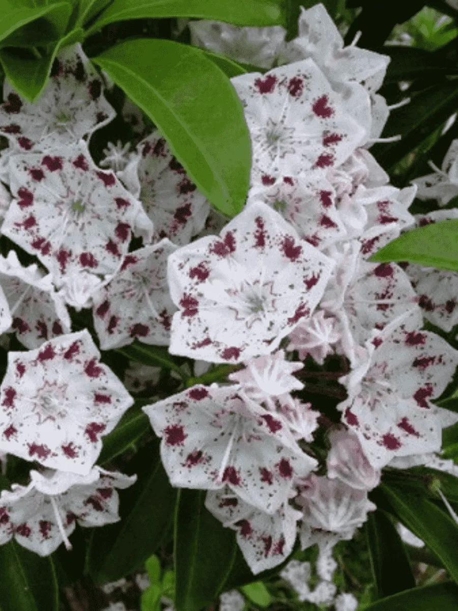 Кальмия широколистная (Kalmia latifolia), известная также под поэтическим названием горный лавр, представляет собой вечнозелёный кустарник или невысокое дерево, достигающее высоты от одного до пяти метров. Её плотные кожистые листья овальной формы располагаются супротивно либо мутовчато, создавая густую крону насыщенного тёмно-зелёного цвета, который особенно ярко проявляется зимой среди заснеженных пейзажей. Весной же растение преображается, покрываясь крупными соцветиями белоснежных или нежно-розовых цветков, собранных в пышные зонтики на концах ветвей. Цветки имеют необычную чашевидную форму с пятью лепестками, слегка загнутыми внутрь, словно миниатюрные фарфоровые чаши, наполненные нежностью и ароматом весны. Растёт кальмия медленно, предпочитая влажные кислые почвы тенистых лесов и горных склонов Северной Америки, где её красота гармонично вписывается в природный ландшафт, украшая леса Новой Англии и Аппалачей своим изысканным обликом.