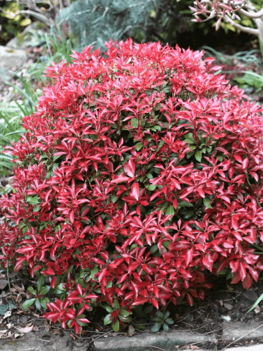Пиерис японский сорта *Mountaine Fire* представляет собой эффектный вечнозелёный кустарник высотой до полутора метров с густой кроной и элегантной формой ветвей. Молодые листья весной окрашены в яркие оттенки оранжевого и красного цветов, постепенно приобретая насыщенный зелёный оттенок летом и бронзовый осенью. Листья продолговатые, гладкие, блестящие, слегка волнистые по краям, придают растению особую декоративность и изысканность. Цветёт пиерис ранней весной крупными кистями белоснежных колокольчатых цветков, источающих тонкий аромат, привлекающий насекомых-опылителей. Растение предпочитает полутень и влажную плодородную почву, хорошо переносит зимние морозы средней полосы России, создавая живописные акценты в садах и парковых композициях.