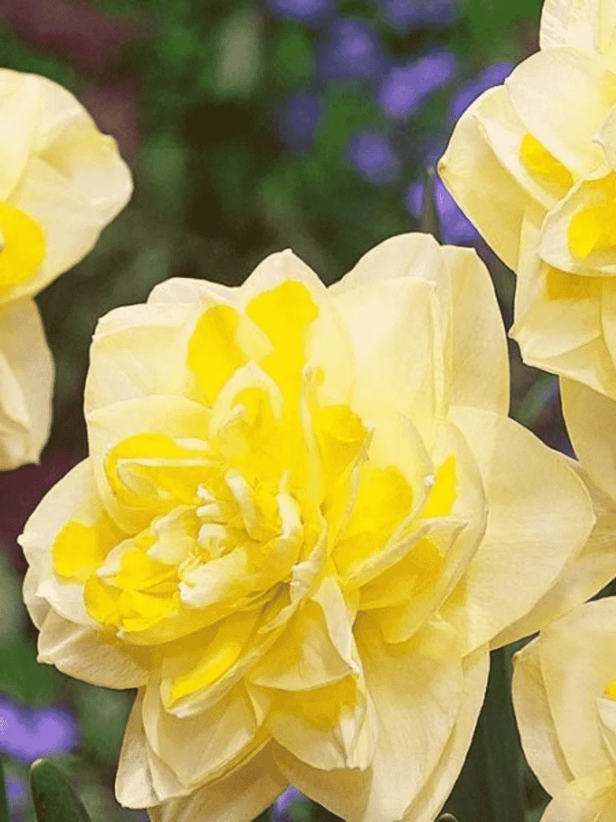 Нарцисс махровый *Sweet Pomponette* пленяет взор нежностью и утончённостью своего облика. Листья узколинейные, ярко-зелёные, гладко блестящие, словно покрытые тонким слоем воскового глянца, образуют аккуратную розетку у основания стебля. Цветонос стройный, прямой, высотой около 35–40 см, несёт один крупный цветок диаметром до 8 см. Лепестки белые, слегка отогнутые назад, окружают пышную сердцевину, состоящую из множества мелких трубчатых лепестков насыщенного жёлтого цвета, придающих соцветию сходство с пушистым помпончиком. Аромат тонкий, сладковатый, едва уловимый, наполняющий воздух весенним настроением. Растение предпочитает солнечные места, хорошо дренированные почвы, легко размножается луковицами, формируя живописные группы на клумбах и газонах. Весной нарциссы распускаются одними из первых, радуя глаз яркими красками после долгой зимы и символизируя приход тепла и обновления природы.