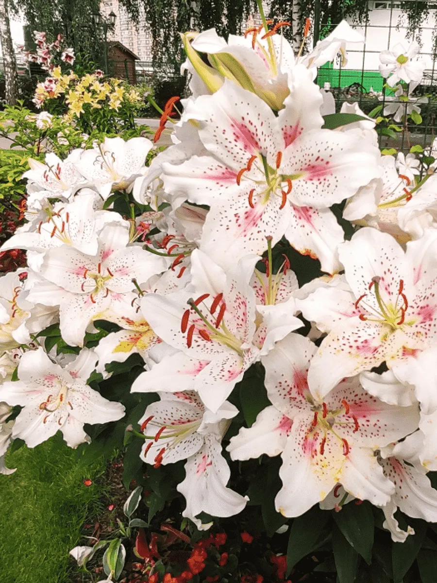 Лилия сорта *Muscadet* пленяет взор изысканным благородством форм и нежностью оттенков. Её стройные стебли достигают высоты до одного метра, увенчанные крупными ароматными цветами, раскрывающимися подобно драгоценным чашечкам. Лепестки нежно-кремовые, слегка отливающие золотистым блеском, украшены мелкими пурпурными пятнышками, придающими особую утончённость облику цветка. Листья ланцетовидные, гладкие, насыщенно-зелёного цвета, гармонично подчёркивающие красоту соцветий. Цветёт лилия обильно и продолжительно, начиная с середины лета и радуя глаз вплоть до первых осенних дней. Предпочитает солнечные участки с плодородной рыхлой почвой, легко адаптируется к различным климатическим условиям, демонстрируя стойкость и неприхотливость. Этот сорт идеально подходит для украшения садов и парков, создавая атмосферу элегантности и спокойствия.
