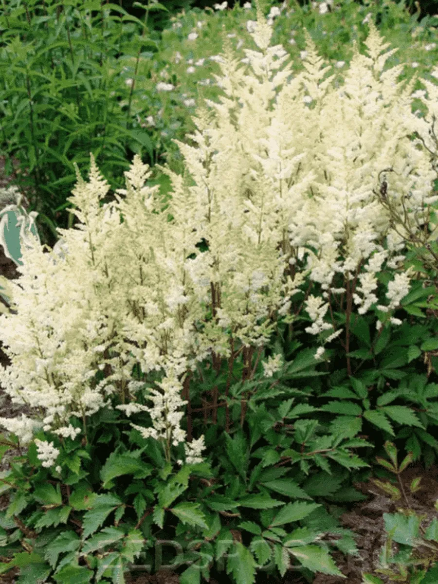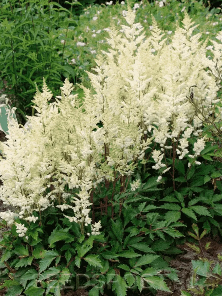 Астильба гибридная сорта *Younique White* пленяет взор нежностью своего облика и изысканностью форм. Это многолетнее травянистое растение образует компактную розетку крупных пальчато-рассечённых листьев насыщенного зелёного цвета, слегка блестящих от воскового налёта. Листья имеют чёткую структуру и приятную фактуру, создавая живописный фон для роскошного цветения. Цветоносы устремляются вверх стройными свечами высотой до полуметра, увенчанные пушистыми метёлками белоснежных цветков, словно облако воздушной свежести над изумрудной листвой. Период цветения длится долго, радуя глаз с середины лета до осени. Растение предпочитает тенистые уголки сада, влажные почвы и прекрасно чувствует себя вблизи водоёмов, где раскрывается во всей своей красоте, наполняя пространство утончённой гармонией природы.