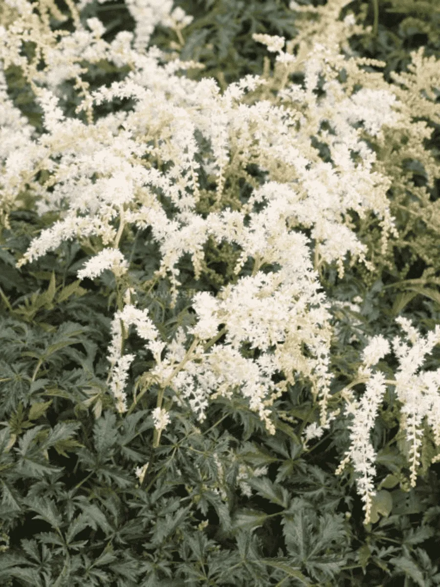 Астильба простолистная *White Sensation* пленяет взор нежностью своего облика и изысканностью форм. Это многолетнее травянистое растение образует пышную куртину высотой до полуметра, украшенную крупными рассечёнными листьями насыщенного зелёного цвета, словно вырезанными искусной рукой мастера. Листья имеют характерную перистую структуру, состоящую из множества мелких листочков, придающих растению воздушность и лёгкость. Но истинное великолепие астильбы раскрывается во время цветения: летом над листвой поднимаются высокие ажурные метёлки белоснежных цветов, будто сотканные из кружевного полотна. Цветоносы устремляются вверх стройными свечами, создавая впечатление легкости и невесомости. Растение предпочитает тенистые уголки сада, влажные почвы и хорошо переносит полутень, радуя глаз своей красотой долгие годы подряд.