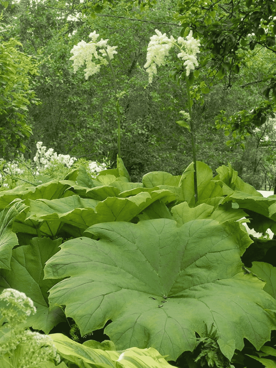 Астильбоидес пластинчатый — эффектная многолетняя культура семейства Камнеломковых, поражающая своей монументальностью и декоративностью. Мощные корневища формируют плотную куртину высотой до метра, увенчанную крупными округло-сердцевидными листьями диаметром около полуметра, покрытыми сверху тёмной бархатисто-зелёной поверхностью, снизу же украшенными серебристым пушком. Листья расположены на длинных крепких черешках, придающих растению величественный облик. Цветёт астильбоидес скромно, мелкими белыми цветами, собранными в рыхлые метельчатые соцветия, возвышающиеся над листвой лишь слегка. Растение предпочитает тенистые влажные места, прекрасно чувствует себя среди камней и вдоль водоёмов, создавая живописные акценты в садах и парках.