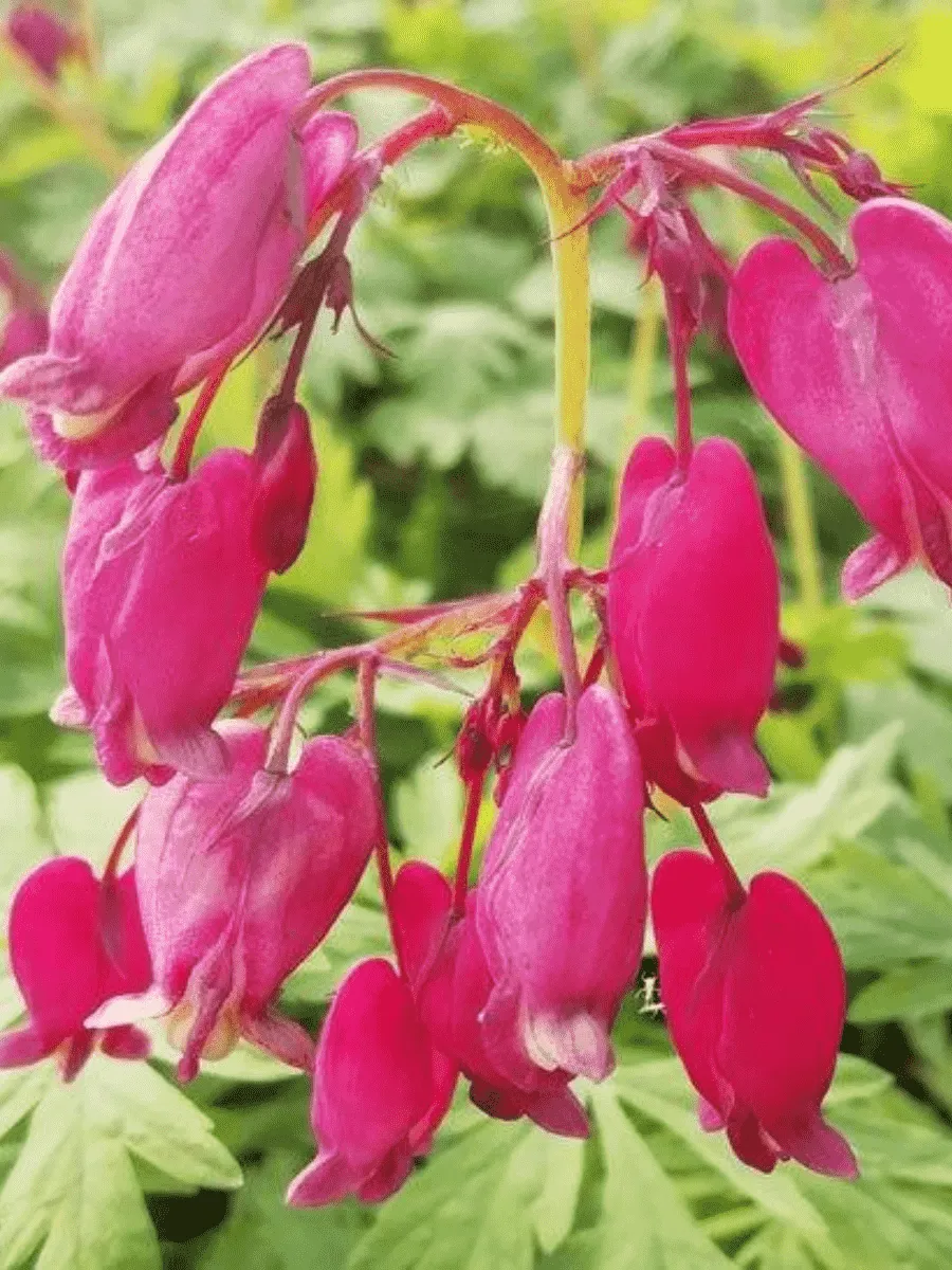 Дицентра изящная сорта *Bacchanal* пленяет взор изысканным сочетанием утончённой формы и насыщенной окраски. Её ажурные листья, рассечённые на узкие сегменты, напоминают кружевную мантию, переливающуюся нежной зелёной гаммой. Цветки поражают своей оригинальностью: крупные сердцевидные лепестки окрашены в глубокий пурпурно-красный оттенок, словно капли драгоценного вина, свисающие на тонких стеблях среди зелени листвы. Высота взрослого растения достигает полуметра, создавая живописные островки красоты в тенистых уголках сада. Период цветения длится с конца весны до начала лета, когда многочисленные соцветия раскрываются во всей красе, привлекая внимание своим необычным видом и элегантностью форм. Предпочитает плодородные почвы и полутень, прекрасно дополняя композиции с хостами, папоротниками и другими тенелюбивыми растениями.