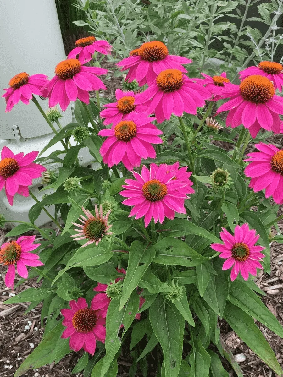 Эхинацея пурпурная сорта *Pow Wow Wild Berry* пленяет взор своей изысканной красотой и благородством форм. Это многолетнее травянистое растение достигает высоты от 45 до 60 сантиметров, обладая компактной округлой формой куста, благодаря чему идеально вписывается даже в небольшие садовые композиции. Листья темно-зелёные, слегка шероховатые, овально-ланцетные, расположены очередно вдоль прямостоячих стеблей, создавая плотную зелёную массу. Цветки крупные, диаметром около 8–10 см, собраны в одиночные корзинки на концах крепких цветоносов. Лепестки насыщенного розово-пурпурного цвета плавно переходят в тёмно-красновато-коричневую центральную головку, придающую соцветиям особую декоративность и экзотичность. Период цветения продолжительный, начинается в июле и продолжается вплоть до сентября, украшая сады яркими красками и привлекая внимание насекомых-опылителей своим ароматом и живописностью. Растёт эхинацея быстро, легко размножается делением корневища и семенами, предпочитая солнечные места и плодородные почвы умеренной влажности.