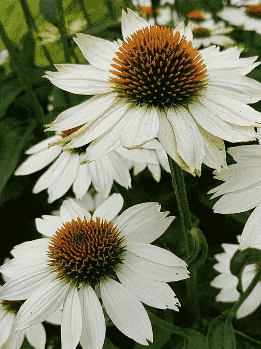 Эхинацея сорта *White Swan* пленяет взор своей изысканной простотой и нежностью форм. Это многолетнее травянистое растение достигает высоты около полуметра, обладая прямостоячими крепкими стеблями, покрытыми короткими волосками. Листья крупные, овально-ланцетной формы, слегка шероховатые на ощупь, окрашены в насыщенный зелёный оттенок, придающий растению свежесть и жизненную силу. Цветки эхинацеи поражают воображение своим великолепием: широкие белые лепестки элегантно расходятся от центра цветка, словно крылья лебедя, раскрывшегося навстречу солнцу. Серединка соцветия представляет собой плотный конусообразный бутон тёмно-коричневого цвета, контрастирующий с белизной лепестков и подчёркивающий природную гармонию композиции. Период цветения длится долго, начиная с середины лета до поздней осени, украшая садовые участки и клумбы яркими белыми акцентами. Растёт преимущественно на открытых солнечных местах, предпочитая плодородные почвы умеренного климата, легко адаптируясь к различным условиям произрастания благодаря своей выносливости и неприхотливости.
