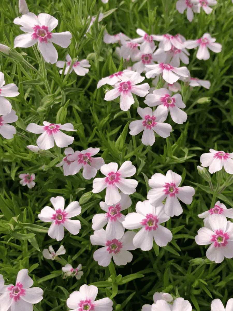 Флокс шиловидный сорта *Pharao Red Eye* представляет собой низкорослый многолетник, формирующий плотную зелёную подушку высотой всего около десяти сантиметров. Его узколинейные листья, словно тонкие иглы, густо покрывают стебли, создавая впечатление мягкого бархата. Цветки собраны в пышные соцветия диаметром до пяти сантиметров, раскрываются ранней весной и радуют глаз вплоть до начала лета. Окраска цветков необычайна: ярко-красная кайма окаймляет белоснежную сердцевину, придавая каждому лепестку эффектный контраст и глубину цвета. Растение предпочитает солнечные участки и хорошо дренированные почвы, легко размножается делением куста и черенкованием, быстро разрастаясь и заполняя пространство живописной ковровой мозаикой.