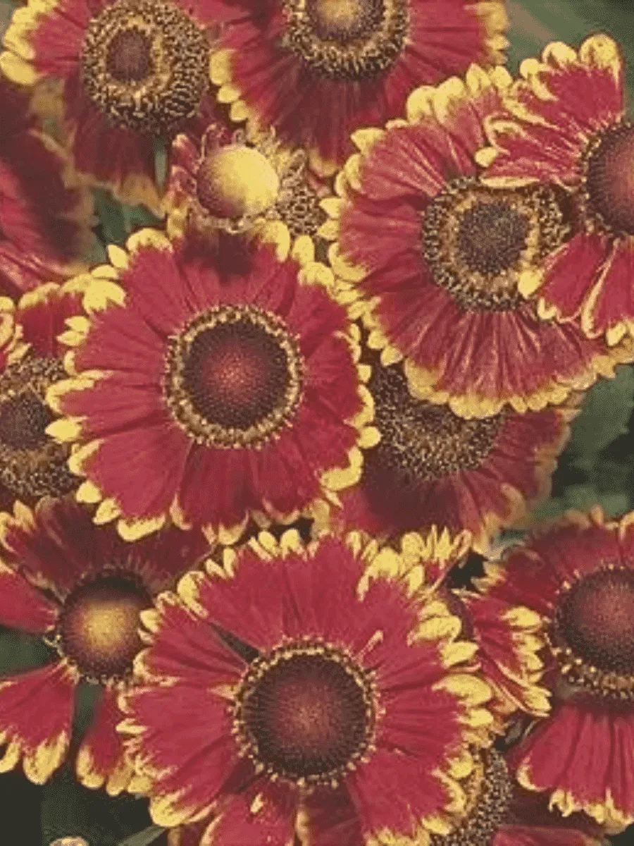 Гелениум осенний сорта *Helena Red Shades* — роскошная многолетняя культура, поражающая своей живописностью и благородством форм. Стройные прямостоячие стебли высотой до полутора метров украшены крупными листьями насыщенного зелёного оттенка, слегка шероховатыми на ощупь и придающими растению особую декоративность даже вне периода цветения. Цветёт гелениум поздним летом и осенью, раскрывая крупные корзинки соцветий диаметром около восьми сантиметров, состоящие из множества мелких трубчатых цветков золотисто-жёлтого цвета, окружённых яркими язычковыми лепестками оттенков от тёмно-красного до пурпурного, плавно переходящими в бордовый и коричневатый тона ближе к центру цветка. Эти грациозные цветы словно вспыхивают ярким пламенем среди увядающей зелени сада, придавая участку особое очарование и завершённость композиции. Растение предпочитает солнечные места, хорошо дренированные почвы средней плодородности и умеренный полив, прекрасно размножается делением корневища и семенами, легко адаптируется к различным климатическим условиям и широко используется в ландшафтном дизайне благодаря своему эффектному внешнему виду и продолжительному периоду цветения.
