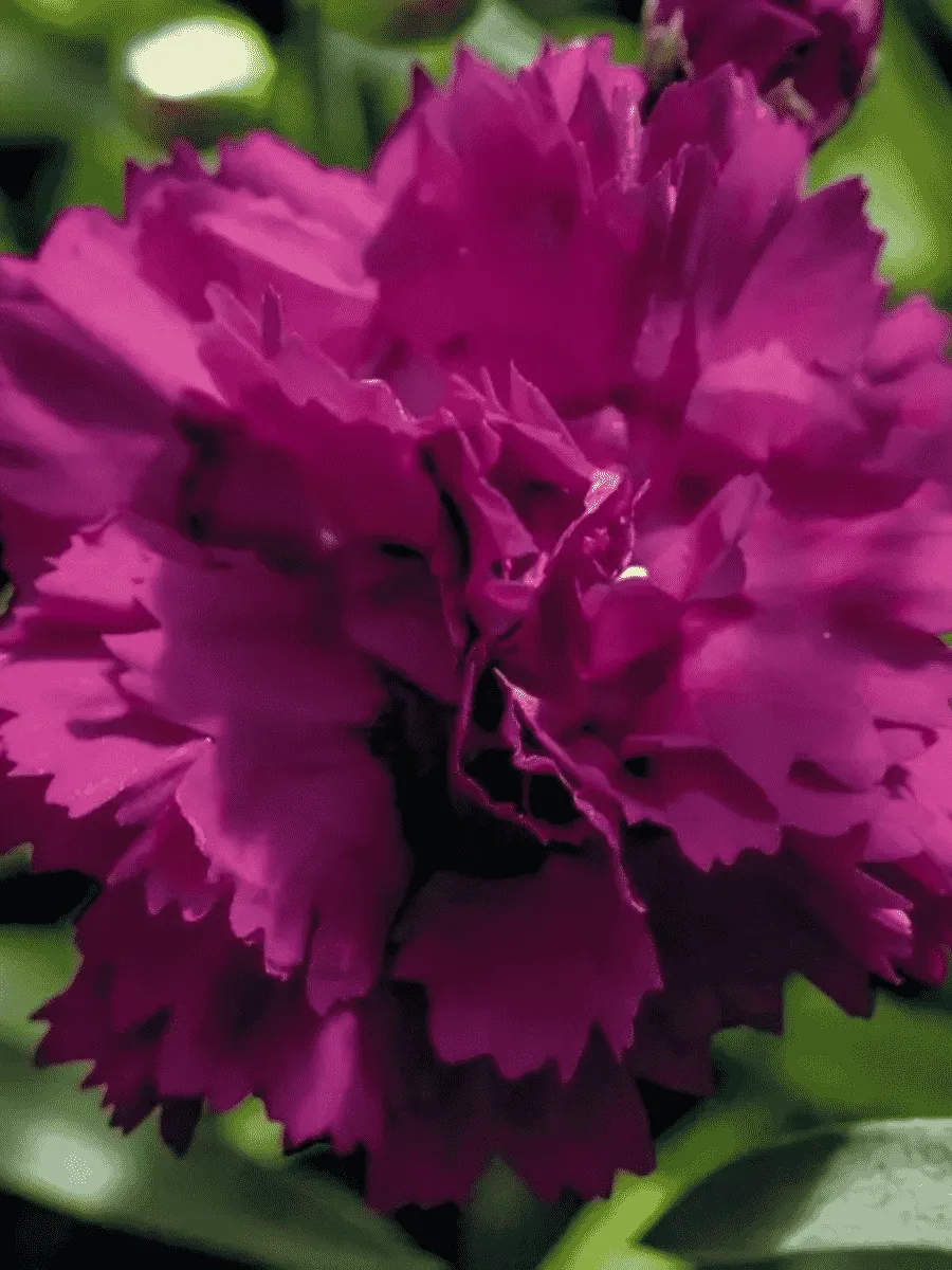 Гвоздика садовая *Code Purple Dark Center* пленяет взор изысканным сочетанием благородной пурпурной окраски лепестков и тёмного бархатистого центра цветка, словно украшенного таинственным оттенком ночи. Листья узколанцетные, гладкие, насыщенно-зелёного цвета, образуют плотную розетку, подчёркивая элегантность соцветий. Цветки крупные, махровые, собраны в рыхлые кисти, источают тонкий аромат, привлекающий внимание своей утончённостью и нежностью. Высота растений варьируется от 45 до 60 см, стебли прочные, прямостоячие, устойчивые к неблагоприятным погодным условиям. Предпочитает солнечные места, хорошо дренированные почвы, легко адаптируется к различным климатическим зонам, радуя садоводов продолжительным периодом цветения с июня по сентябрь.