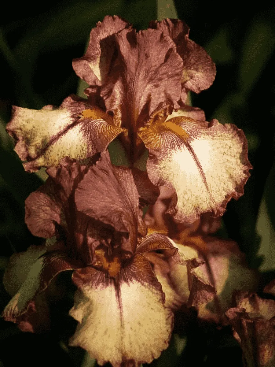 Ирис германский сорта *Burgundy Brown* пленяет взор роскошью тёмной бархатисто-шоколадной окраски крупных цветков, оттенённых едва уловимым пурпурным отливом и золотистыми лучиками вокруг жёлтой бородки. Листья узколинейные, ярко-зелёные, слегка дугообразно изгибаются, создавая живописную композицию над поверхностью земли. Высота взрослого растения достигает 85–90 см, оно образует плотные кустики с мощными корневищами, позволяющими успешно зимовать даже в суровых климатических условиях средней полосы России. Цветёт обильно и продолжительно, начиная с конца мая до середины июня, наполняя сад неповторимой атмосферой старинного благородства и утончённой элегантности.