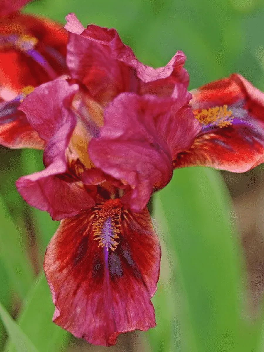 Ирис карликовый *Lady in Red* пленяет взор своей изысканной миниатюрностью и утончённой красотой. Это компактное растение высотой всего около 15–20 см обладает узкими линейными листьями насыщенного зелёного цвета, придающими кустику лёгкость и воздушность. Цветки раскрываются ранней весной, поражая яркостью и контрастностью оттенков: тёмно-красная нижняя губа венчика эффектно оттеняется золотисто-жёлтыми верхними лепестками, создавая впечатление элегантной дамы в роскошном красном наряде. Бутоны появляются прямо над листвой, словно драгоценности, украшающие стройную фигуру красавицы. Растёт медленно, формируя плотные аккуратные куртины, идеально подходящие для рокариев, бордюров и контейнерного озеленения. Предпочитает солнечные места и хорошо дренированные почвы, легко адаптируется к различным условиям выращивания, радуя садоводов своим нежным очарованием долгие годы.