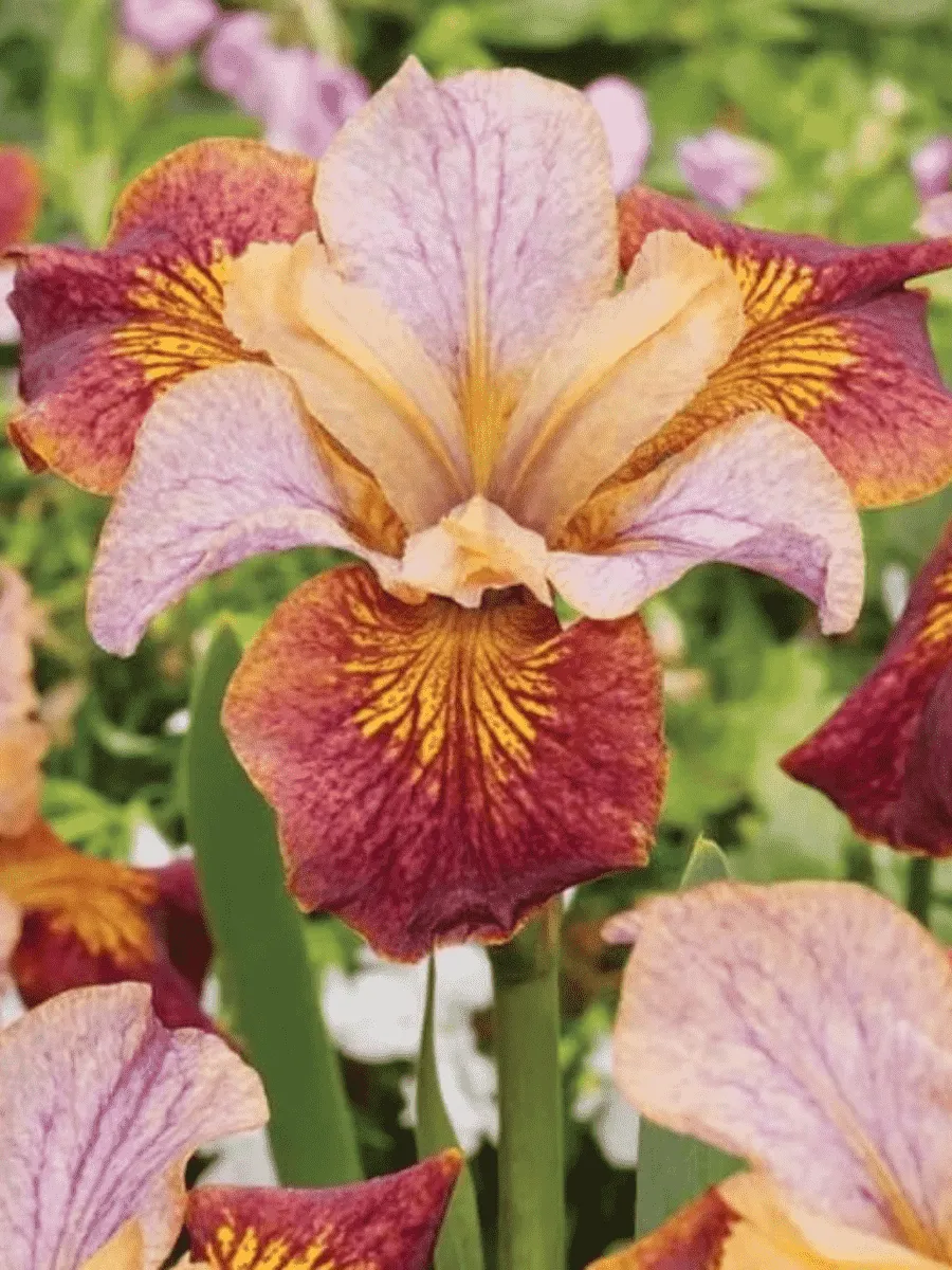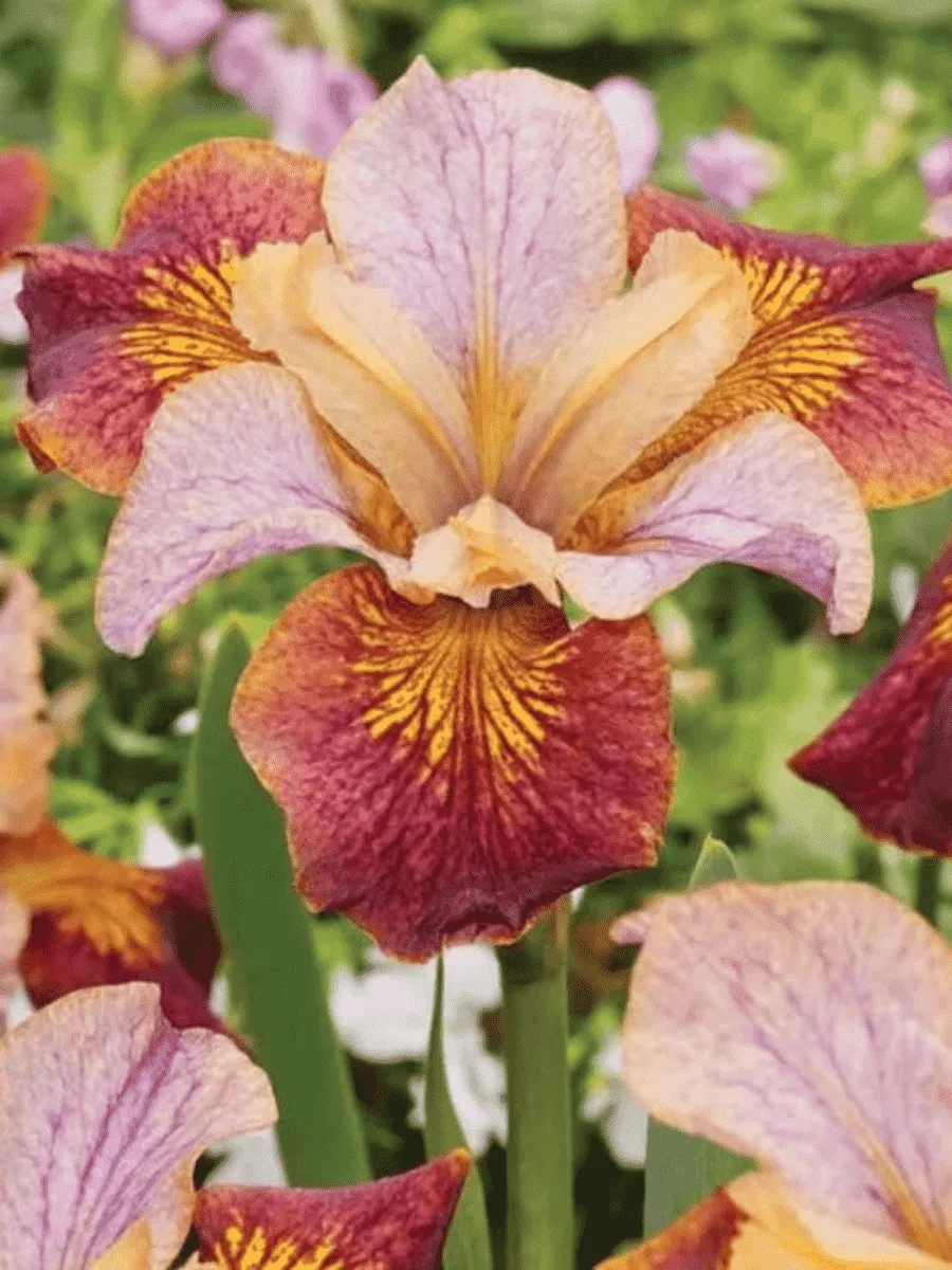 Ирис сибирский сорта *Paprikash* пленяет взор своей утончённой красотой и благородством форм. Высокорослое растение достигает до метра высоты, украшая сад стройной вертикальной линией узких мечевидных листьев насыщенного зелёного цвета, словно клинки мечей древних воинов, устремлённых вверх. Цветоносы несут крупные цветки диаметром около десяти сантиметров, раскрывающиеся в июне-июле. Лепестки венчика окрашены в нежную кремово-белую гамму с едва заметным лимонным оттенком, контрастируя с яркими красно-коричневыми пятнами на нижних долях, придающих растению особую пикантность и шарм. Корневище мощное, горизонтально разрастающееся, позволяет быстро формировать плотные куртины, устойчивые к суровым климатическим условиям средней полосы России. Этот сорт прекрасно чувствует себя на влажных плодородных почвах, предпочитая солнечные места, где демонстрирует всю свою природную прелесть и очарование.