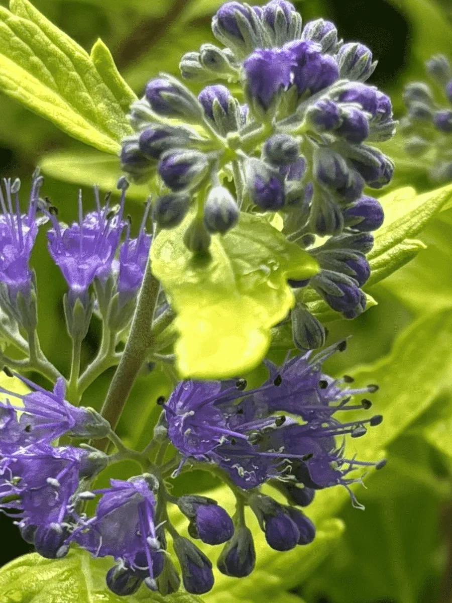 Кариоптерис кландоненский сорт 'Gold Crest' представляет собой компактный кустарник высотой до одного метра с густой кроной и прямостоячими побегами, покрытыми нежной бархатистостью. Листья мелкие, ланцетные, ярко-золотисто-жёлтые, словно солнечные блики, переливающиеся на солнце, создавая эффект сияния и свежести. Цветёт обильно и продолжительно, начиная с конца лета и вплоть до первых заморозков, покрываясь мелкими сиренево-голубыми цветами, собранными в плотные щитковидные соцветия, источающие тонкий аромат, привлекающий насекомых-опылителей. Растение отличается неприхотливостью, устойчиво к засухе и морозу, быстро восстанавливается после обрезки, легко размножается черенкованием и прекрасно подходит для оформления бордюров, миксбордеров и каменистых садов, привнося яркие краски и очарование даже поздней осенью.