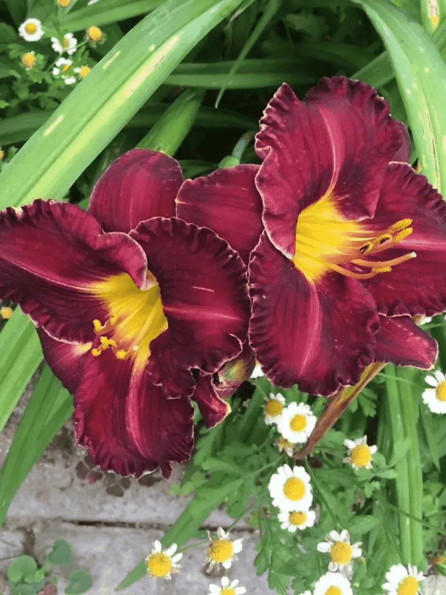 Лилейник *Black Stockings* пленяет взор своей изысканной простотой и благородством форм. Листья длинные, узколинейные, слегка дугообразно изгибающиеся, словно струящиеся ленты шелка, придают растению элегантность и утонченность. Цветоносы высокие, стройные, поднимаются над лиственной массой, увенчанные крупными цветами диаметром около 15 см. Лепестки бархатистые, глубокого темно-бордового цвета с едва уловимым пурпурным отливом, контрастируют с ярко-желтым горлом цветка, создавая эффектную игру оттенков. Бутоны раскрываются постепенно, продлевая период цветения до нескольких недель. Растение неприхотливо, устойчиво к болезням и неблагоприятным условиям среды, прекрасно адаптируется к различным типам почв и освещенности, становясь украшением садов и парков, где бы ни поселилось.