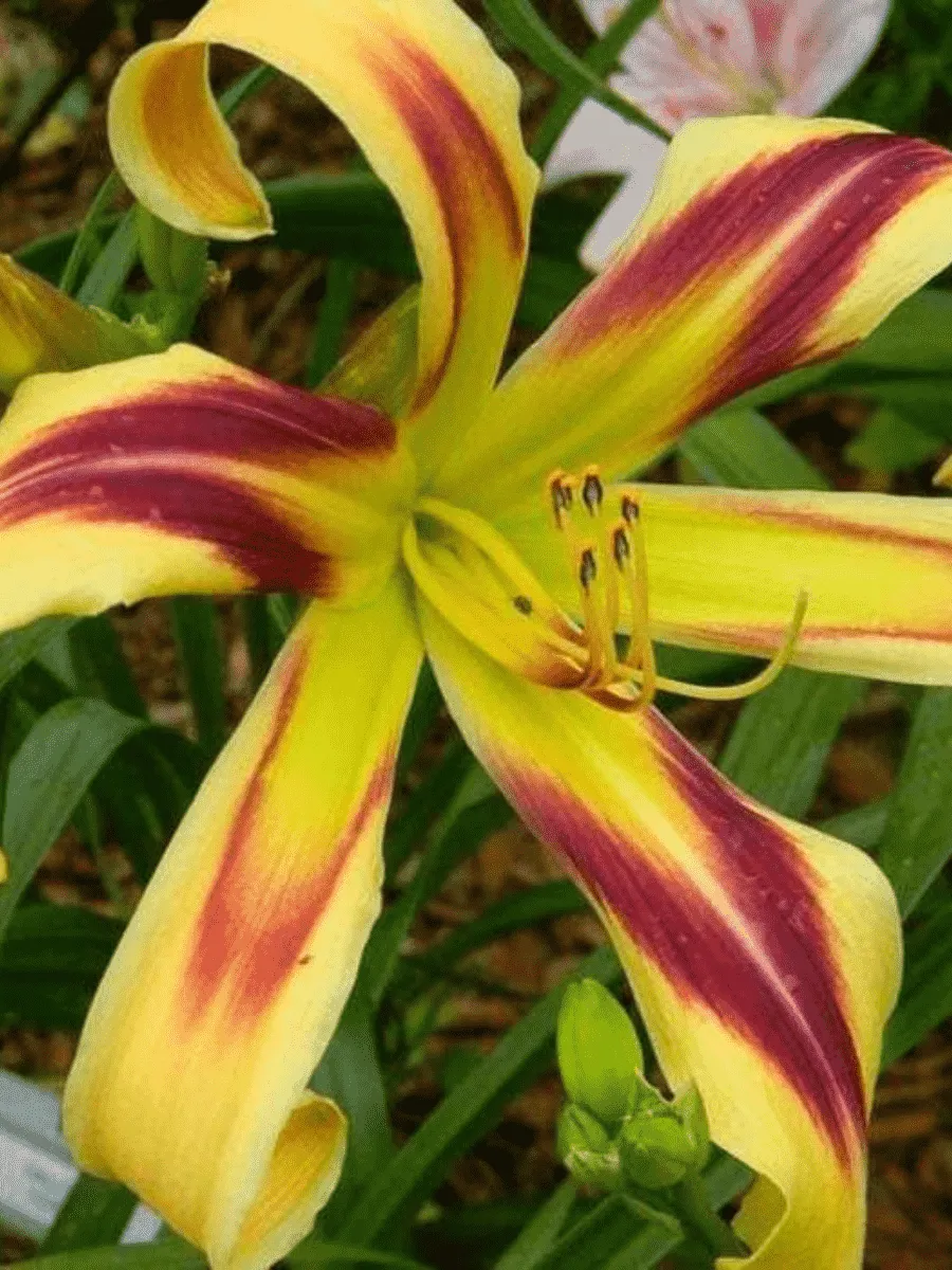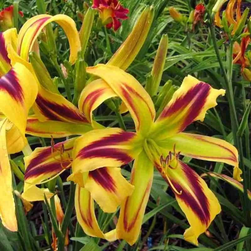 Лилейник *Free Wheelin* пленяет взор изысканным сочетанием нежности и силы. Его листья узколанцетной формы собраны в плотную прикорневую розетку, создавая живописный фон для роскошного цветения. Цветоносы устремляются вверх, достигая высоты около метра, увенчанные крупными цветами диаметром до 15 см. Лепестки цветка окрашены в насыщенный красно-оранжевый оттенок с золотистым отливом, плавно переходящим в кремово-жёлтые тона ближе к центру венчика. Сердцевина украшена контрастными тёмно-красными штрихами, придающими особую декоративность каждому лепестку. Период цветения продолжительный, растение радует глаз яркими красками с июня по август. Корневище мощное, разветвлённое, способствующее быстрому распространению лилейника на участке. Благодаря своей неприхотливости и устойчивости к неблагоприятным условиям, этот сорт прекрасно адаптируется практически в любых климатических зонах умеренного пояса, становясь украшением садов и парков.