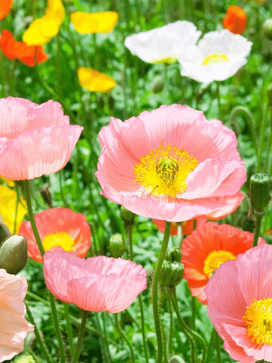 Мак голостебельный сорта *Chambagne Bubbles Mix* пленяет взор нежностью лепестков, переливающихся оттенками от нежно-кремового до золотисто-абрикосового цвета, словно пузырьки шампанского играют солнечными лучами среди зелени садов. Стройные стебли высотой около полуметра несут крупные цветки диаметром до десяти сантиметров, раскрывающиеся утром и закрывающиеся вечером, создавая иллюзию мимолетности и хрупкости жизни. Листья рассечённые, серо-зелёные, покрыты лёгким пушком, контрастируя с яркими цветами бутонов и подчёркивая воздушность облика растения. Цветёт обильно и продолжительно, начиная с конца весны и заканчивая летом, украшая клумбы, миксбордеры и альпийские горки своей изысканной простотой и утончённой красотой.