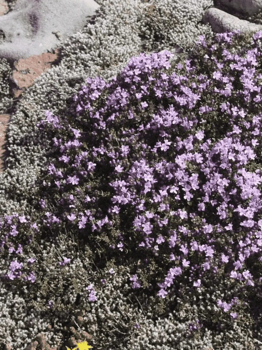 Тимьян ползучий сорта *Magic Carpet* пленяет взор своей изысканной миниатюрностью и нежной красотой. Это компактное почвопокровное растение образует плотную бархатисто-зелёную подушку высотой всего около пяти сантиметров, украшая садовые композиции тонким ароматом и живописной листвой. Листья мелкие, округлые, густые, словно изумрудная мозаика, переливающаяся оттенками от светло- до тёмно-зелёного цвета. Цветёт тимьян обильно мелкими розово-лиловыми цветами, собранными в небольшие соцветия, создавая эффект лёгкого облачка над зелёным ковром. Растение отличается медленным ростом, постепенно разрастаясь горизонтально и заполняя пространство между камнями или плиткой дорожек, превращая любой уголок сада в очаровательную картину природы.