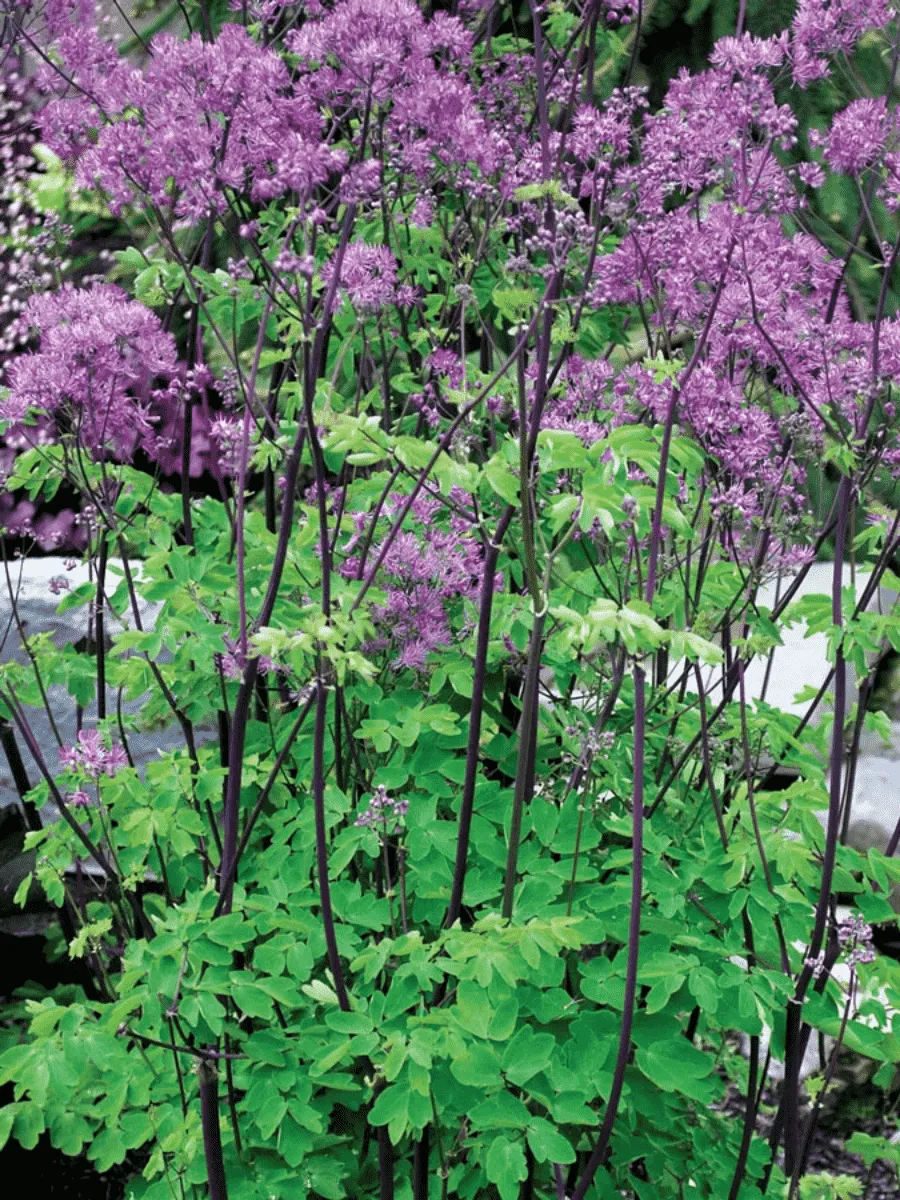 Василистник Делавея 'Black Stockings' (Thalictrum delavayi 'Black Stockings') — элегантная многолетняя культура семейства Лютиковые, покоряющая сердца садоводов утончённой красотой и благородством облика. Стройные побеги высотой до метра несут крупные пальчато-рассечённые листья тёмной бархатисто-зелёной окраски с глубоким пурпурным оттенком, словно облачённые в чёрные чулки, давшие сорту своё поэтическое название. Цветёт растение обильно и продолжительно, начиная с июня и вплоть до сентября, покрываясь нежнейшими кистями мелких цветков кремово-белого цвета, парящих над листвой подобно воздушному облаку. Предпочитает полутень и плодородную влажную почву, прекрасно вписываясь в теневые сады, рокарии и миксбордеры, где становится истинным украшением ландшафта своей изысканной декоративностью и грациозностью форм.