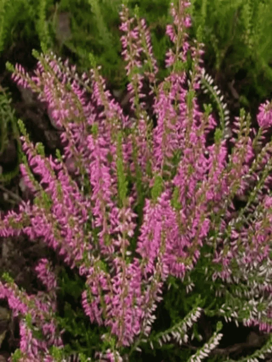 Вереск обыкновенный сорта *Jette* — очаровательное вечнозелёное растение, покоряющее сердца садоводов своей утончённой красотой и неприхотливостью. Этот невысокий кустарник достигает всего лишь полуметра высоты, формируя плотную округлую крону, словно миниатюрная зелёная шапочка, укрывающая землю мягким ковром. Листья мелкие, игольчатые, густо покрывают ветви, создавая впечатление нежной изумрудной дымки, особенно привлекательной весной и летом. Но истинное великолепие вереска раскрывается во время цветения: многочисленные колокольчики нежно-розового оттенка распускаются на концах ветвей, превращаясь в пышные ароматные кисти, источающие тонкий медовый запах. Цветёт вереск долго, начиная с конца лета и продолжая радовать глаз до глубокой осени, когда большинство растений уже увяли. Растение предпочитает солнечные места и лёгкую песчаную почву, легко адаптируясь даже к суровым условиям северных регионов, где оно широко распространено благодаря своей выносливости и декоративности.