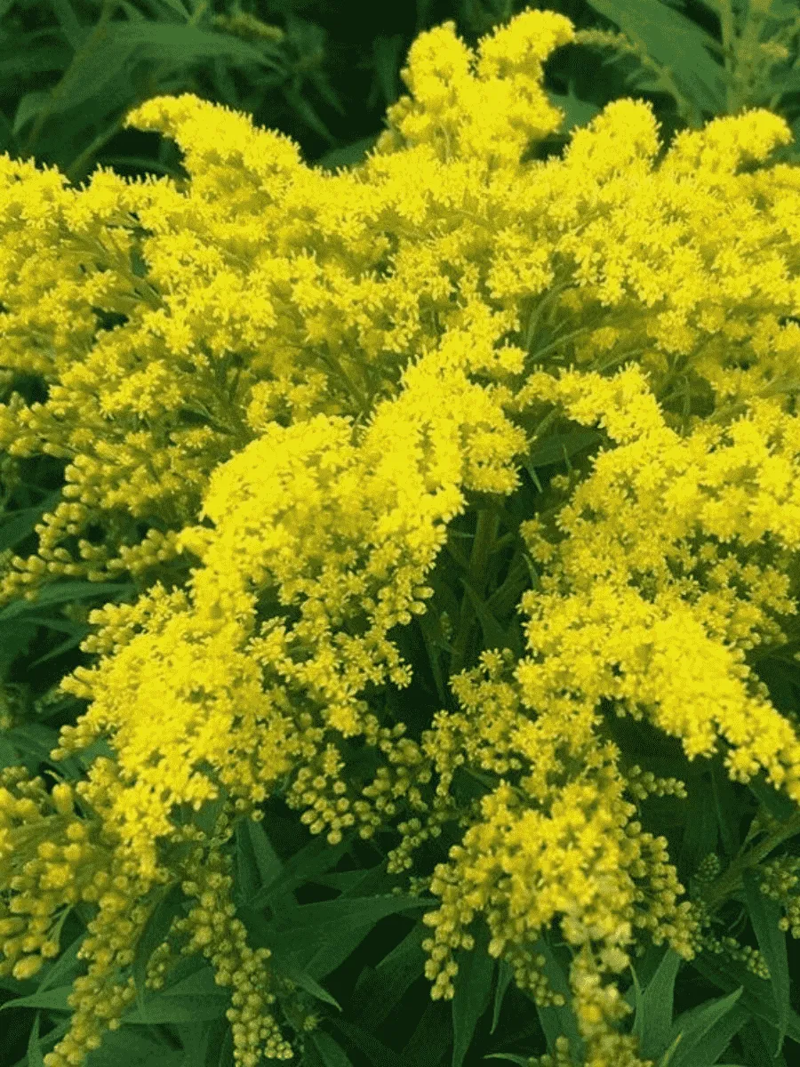 Золотарник канадский сорта *Goldkind* представляет собой эффектную травянистую многолетнюю культуру, достигающую высоты до полутора метров и украшающую садовые композиции яркими золотисто-жёлтыми красками. Его прямостоячие крепкие стебли покрыты узкими линейно-ланцетными листьями насыщенного зелёного оттенка, слегка шероховатыми на ощупь и придающими растению особую декоративность даже вне периода цветения. Цветёт сорт продолжительно, начиная с конца июля и вплоть до глубокой осени, покрываясь многочисленными мелкими корзинками цветков, собранными в крупные метельчатые соцветия, словно солнечные лучи, освещающие осенний пейзаж. Растение отличается неприхотливостью, устойчиво к болезням и неблагоприятным погодным условиям, легко размножается корневищем и прекрасно адаптируется к различным типам почв, предпочитая хорошо дренированные участки с умеренным увлажнением. Благодаря своей пышности и яркости, золотарник *Goldkind* становится незаменимым элементом ландшафтного дизайна, привлекающим внимание садоводов и любителей природы своим жизнерадостным обликом и способностью сохранять привлекательность до наступления холодов.