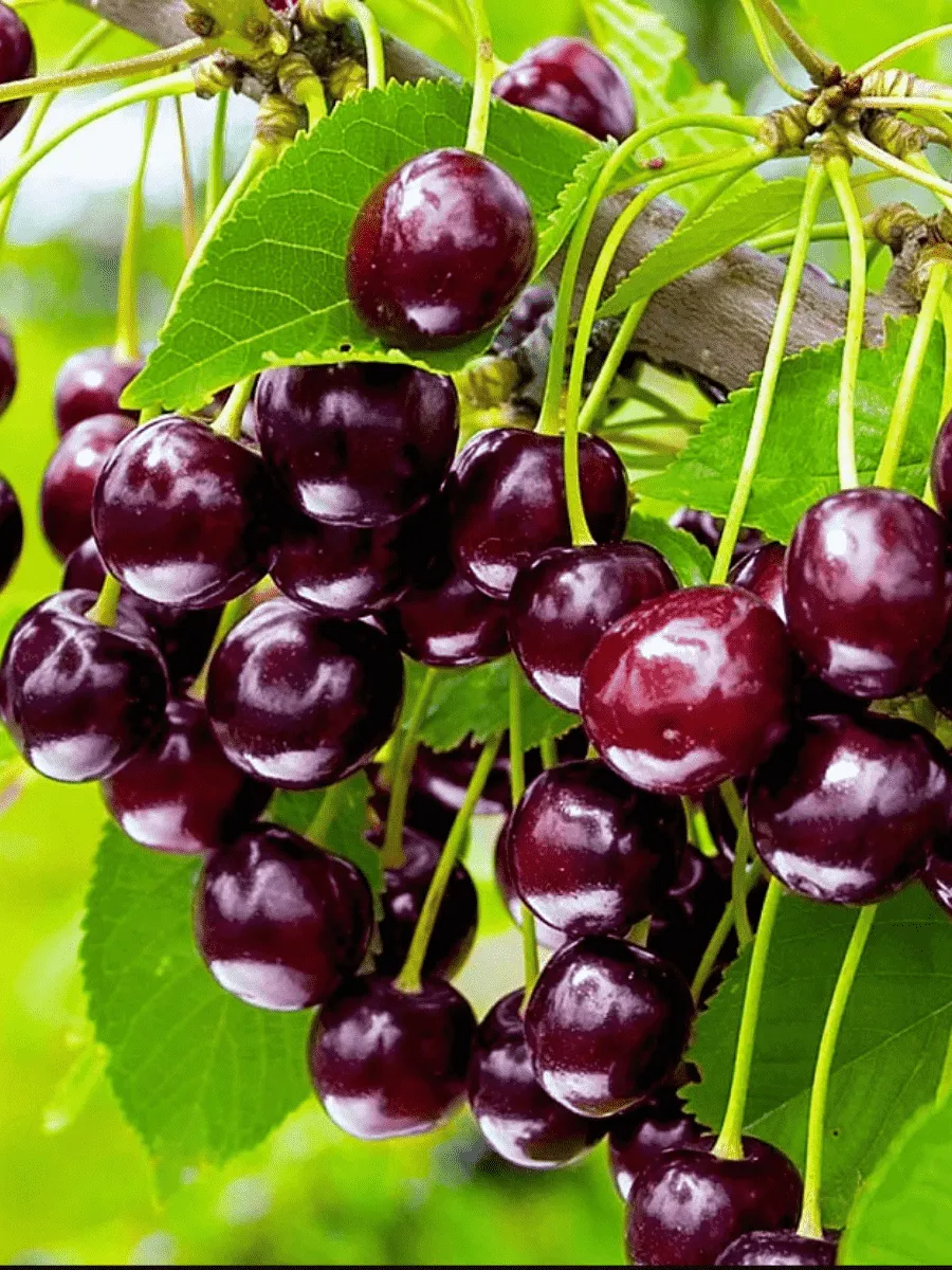 средней массой 4,7 г, максимальной 7,1 г, широкосердцевидной формы, окраска плода, мякоти и сока темно-красная, мякоть плотная, плодоножка средней длины и толщины