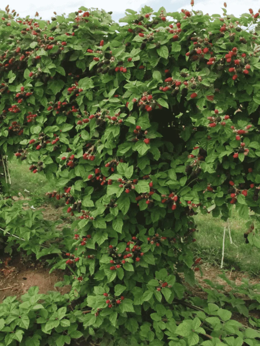 Ежевика ремонтантная сорта *Hall's Beauty* представляет собой элегантную полувечнозелёную лиану с гибкими побегами длиной до трёх метров, покрытыми мелкими шипиками и густым пушком. Листья тройчатые, кожистые, тёмно-зелёные сверху и серебристо-белые снизу, слегка блестящие, с чётко выраженными жилками и волнистым краем. Цветки крупные, одиночные или собранные в небольшие кисти, белоснежные, ароматные, диаметром около пяти сантиметров, распускаются дважды за сезон — весной и осенью. Растёт быстро, легко укореняется отводками, предпочитает плодородные почвы и солнечные места, однако способна переносить лёгкое затенение. Благодаря своей декоративности и длительному периоду цветения широко используется в ландшафтном дизайне для вертикального озеленения беседок, арок и стен зданий, создавая живописные зелёные композиции и привлекая внимание нежностью своего облика.
