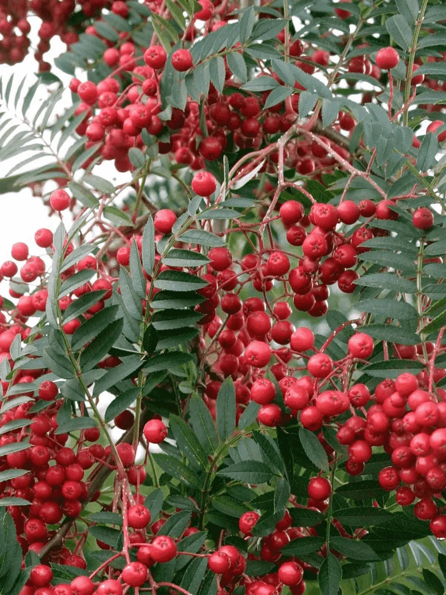 Рябина алая крупная (Sorbus aucuparia 'Grandiflora') представляет собой живописную декоративную разновидность обыкновенной рябины, отличающуюся крупными соцветиями и эффектной листвой. Это дерево средней высоты с раскидистой кроной, достигающее до 15 метров в высоту, обладает стройностью силуэта и грациозностью ветвей. Листья крупные, перисто-сложные, состоят из множества узких листочков насыщенного зелёного цвета, приобретающих осенью яркие оттенки оранжевого и красного цветов, создавая незабываемое зрелище осеннего сада. Цветёт рябина обильно белыми ароматными цветами, собранными в пышные щитковидные соцветия диаметром около 8–10 см, украшая сад нежным благоухающим облаком во время цветения. Растение предпочитает умеренно влажные плодородные почвы, хорошо переносит полутень, устойчиво к городским условиям и зимостойко. Благодаря своей красоте и неприхотливости широко используется в ландшафтном дизайне парков, садов и скверов, где становится настоящим украшением пространства.