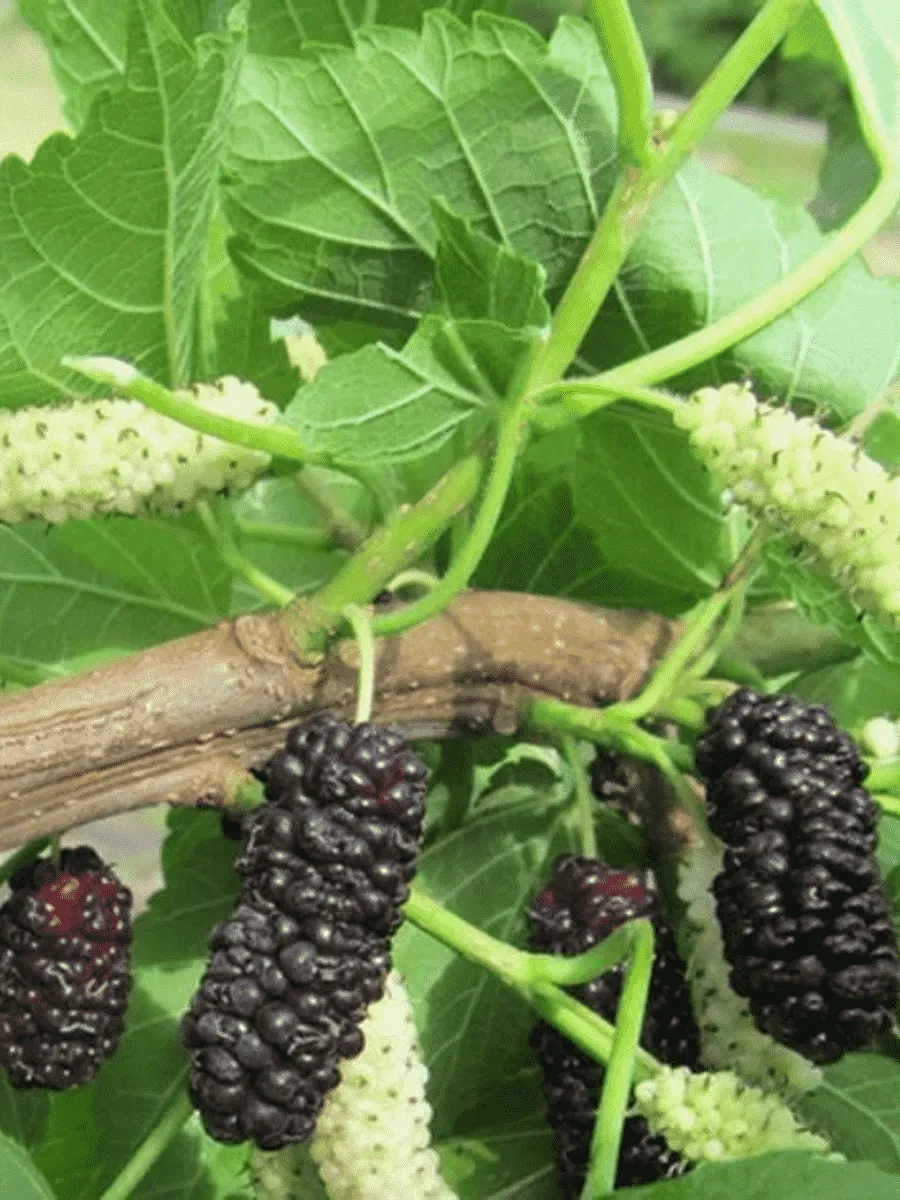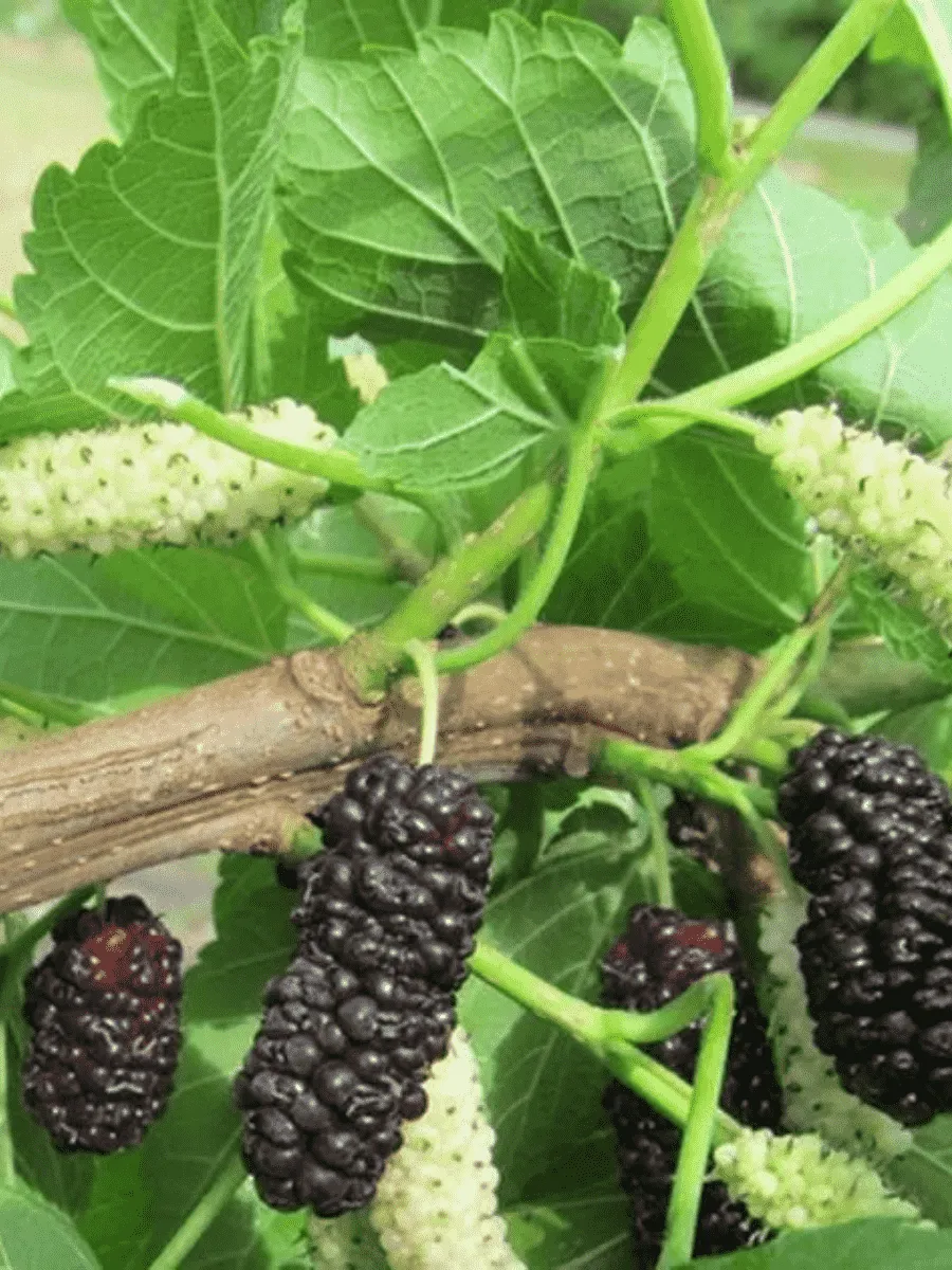Шелковица чёрная сорта *Illinois Everbearing* представляет собой величественное дерево с раскидистой кроной и мощной корневой системой, достигающее высоты до десяти метров. Листья крупные, сердцевидные, слегка шероховатые, насыщенно-зелёного цвета, украшенные волнистым краем и отчётливо выраженными жилками. Цветёт растение мелкими невзрачными цветами, собранными в короткие серёжки, едва заметные среди густой листвы. Отличительной особенностью является продолжительное цветение, начинающееся ранней весной и завершающееся лишь поздним летом. Дерево отличается быстрым ростом, неприхотливостью и устойчивостью к неблагоприятным условиям среды, легко адаптируясь даже к суровым климатическим зонам средней полосы России. Благодаря своей декоративности и способности создавать густую тень, шелковица широко используется в ландшафтном дизайне парков и садов, радуя глаз пышностью зелёного убранства и даря прохладу жарким летним дням.