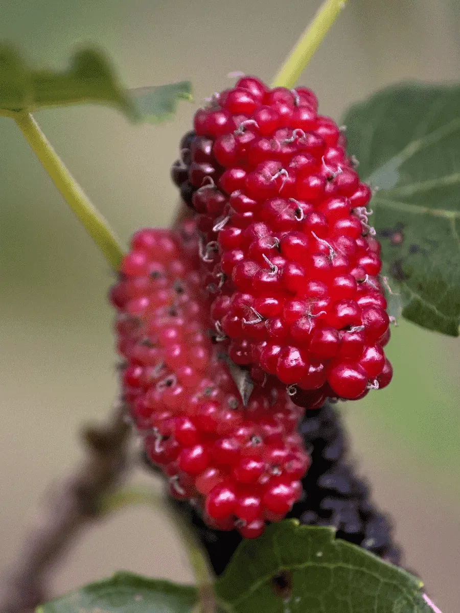 Шелковица чёрная сорта *Red №2* представляет собой величественное дерево с раскидистой кроной и мощной корневой системой, достигающее высоты до десяти метров. Листья крупные, сердцевидные, слегка шероховатые, насыщенно-зелёного цвета, украшенные чётко выраженными жилками, придающими особую декоративность растению. Цветёт шелковица мелкими невзрачными цветами, собранными в соцветия-колоски, едва заметные среди густой листвы. Растение отличается быстрым ростом, неприхотливостью и устойчивостью к неблагоприятным условиям среды, легко адаптируясь даже в городских условиях. Особенно эффектна шелковица осенью, когда её листья приобретают яркие оттенки жёлтого и оранжевого цветов, создавая живописную картину осеннего сада.