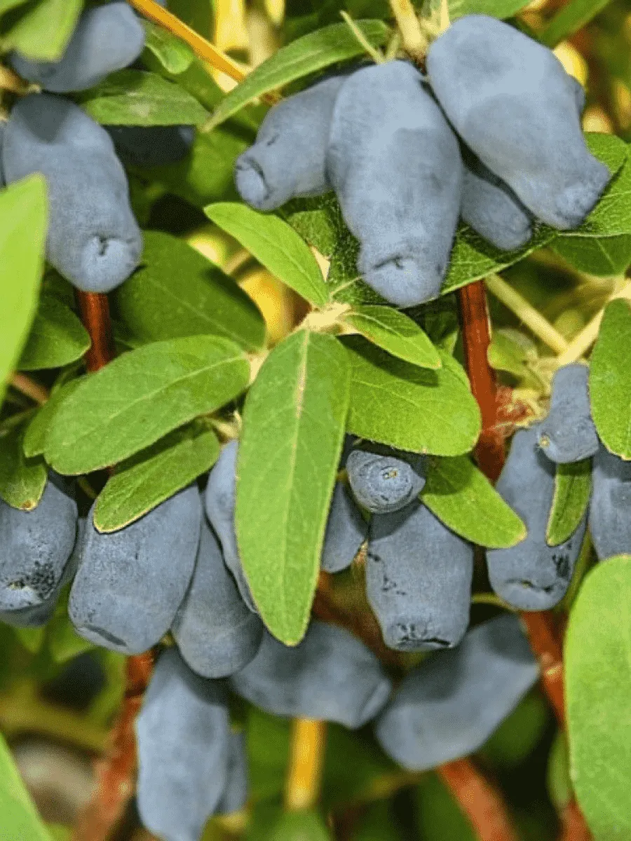 Жимолость плодовая сорта *Фиалка* представляет собой компактный кустарник высотой до полутора метров с густой кроной, состоящей из множества тонких, гибких ветвей, покрытых гладкой серо-коричневой корой. Листья овально-ланцетной формы, слегка заострённые на концах, окрашены в насыщенный тёмно-зелёный оттенок сверху и чуть светлее снизу, создавая эффект переливающейся зелени. Цветки появляются ранней весной, формируя небольшие кистевидные соцветия, украшенные нежными трубчатыми цветами глубокого сине-фиолетового цвета с едва заметным пурпурным отливом, источающими тонкий аромат, привлекающий насекомых-опылителей. Растёт быстро, легко адаптируется к различным условиям среды, предпочитая солнечные места и плодородную почву, устойчива к морозам и засухе, распространена преимущественно в садах и парковых зонах умеренного климата Евразии.